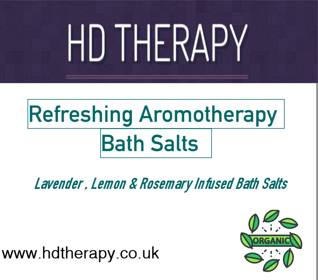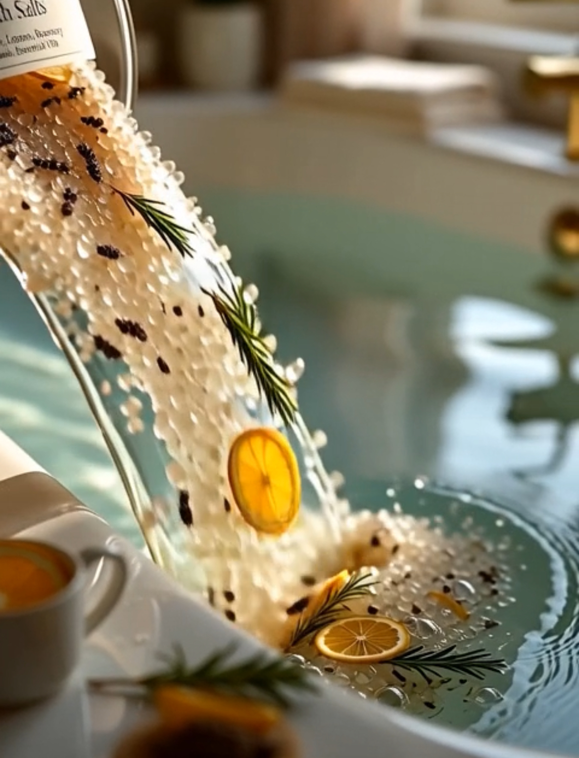 Refreshing aromatherapy magnesium bath salts with organic lavender, lemon, and rosemary essential oils creating a luxury spa setting.